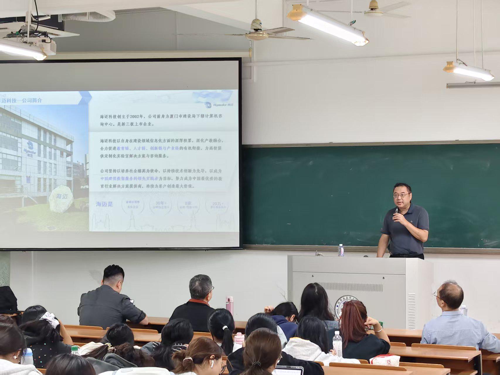 第二场讲座,海迈科技张泓董事长的分享,为同学们进行了一次深刻的行业认知升级。他以“把握趋势 智造未来——赋能建筑产业升级培养新型智造人才”为主题,为学子们带来了一场兼具行业高度与实践温度的专题分享。他权威解读了地下管线建设等国家战略方向下的行业机遇,概述了数字建造、虚拟建造、工业建造、智慧建造四大关键场景的核心应用,以及 BIM、AI、大数据等技术在工程设计、施工、造价、运维全链条的创新实践,为学子们勾勒出智能建造的行业蓝图与职业路径。
