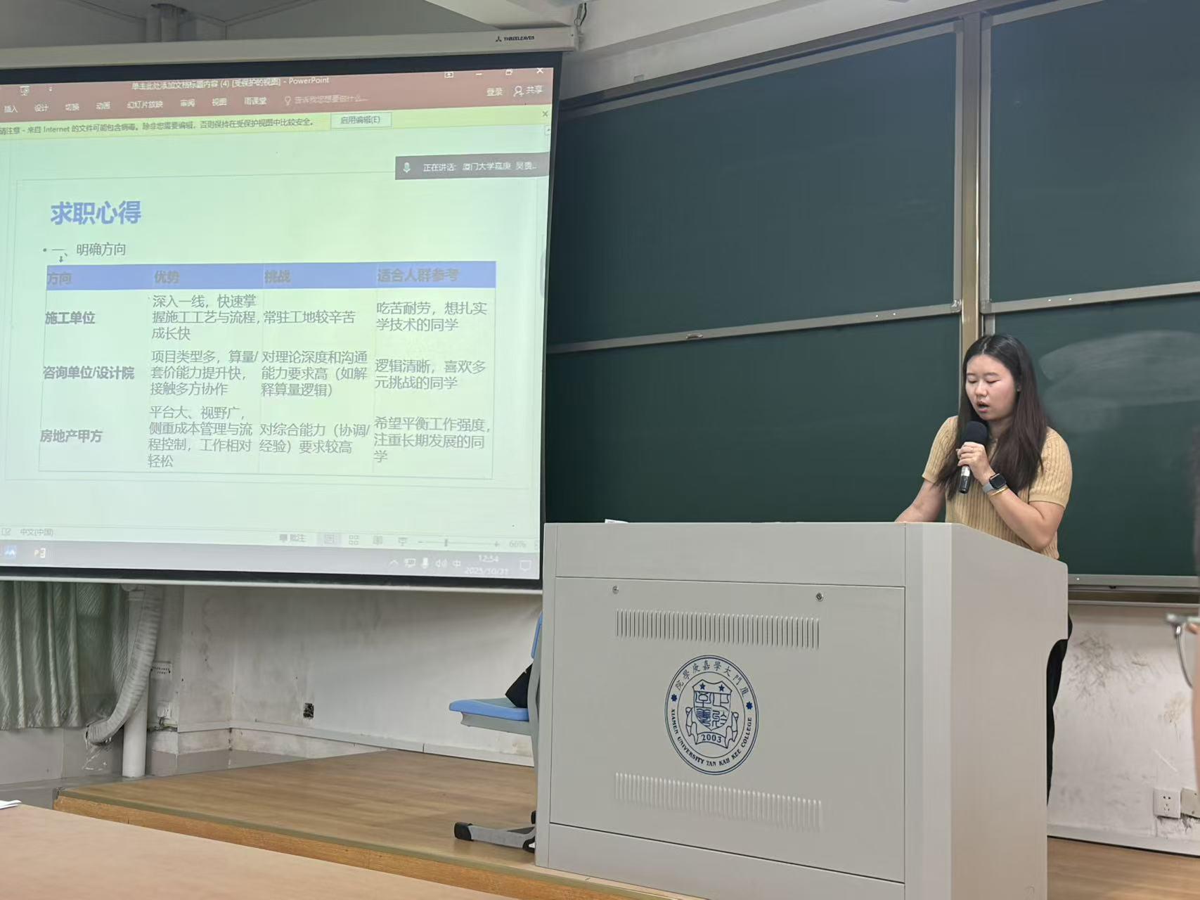陈榆韬学长立足行业前沿,为同学们进行前瞻解读:从“十五五”规划勾勒的未来造价蓝图,到AI技术为行业带来的深刻变革,再到具体的职业发展路径和职业细分领域,他都进行了深入剖析,为同学们的学业与职业规划提供了明确指引。