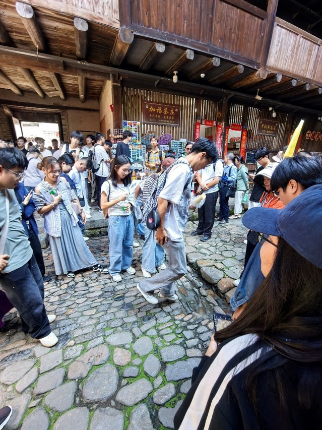 荣登世界文化遗产名录的南靖土楼,以生土、石头、竹片为原料,展现了“化腐朽为神奇” 的营造智慧。新生们重点参观了和贵楼与怀远楼——建在沼泽地上的和贵楼,凭借松木桩基与筏基技术稳立200余年,其地基稳固原理与现代智能监测中的结构健康诊断技术形成呼应;建筑工艺精美的怀远楼,双环形布局与祖堂核心设计,为智能空间规划与绿色建筑设计提供了传统样本。