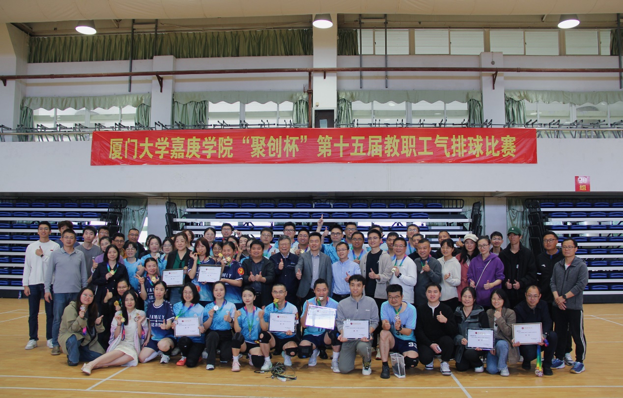 4月3日,厦门大学嘉庚学院北区风雨球馆二楼内呐喊声与欢呼声此起彼伏,备受瞩目的“聚创杯”第十五届教职工气排球比赛决赛在此激情上演。经过多轮激烈角逐,由土木工程学院与法学院教职工携手组成的“法木垒Family联队”在女子组决赛中凭借默契的团队配合与沉稳的赛场发挥,一路过关斩将,最终摘得桂冠,为本次赛事画上圆满句号。土木工程学院院长黄然也来到现场,为队员们加油助威。